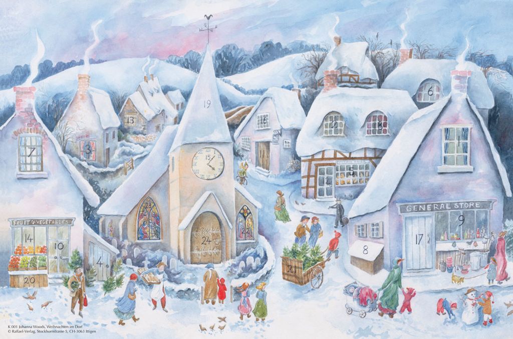 Stig in i en förtrollande vintervärld med denna underbara adventskalender, Jul i byn, illustrerad med värme och nostalgi. En snötäckt liten by där julförberedelserna är i full gång – barn bygger snögubbar, granar pyntas och doften av nybakat sprider sig från de små stugorna. Bakom de 24 luckorna döljer sig små, hemliga bilder som sprider glädje och förväntan varje decemberdag fram till jul. Varje detalj i motivet berättar en egen historia och väcker känslan av en klassisk jul fylld av gemenskap, värme och tradition – perfekt att hänga på väggen och njuta av hela adventstiden.