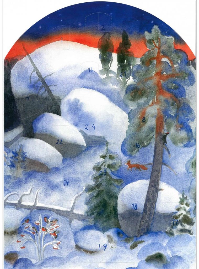 Vacker julkalender från ett nordiskt vinterlandskap.