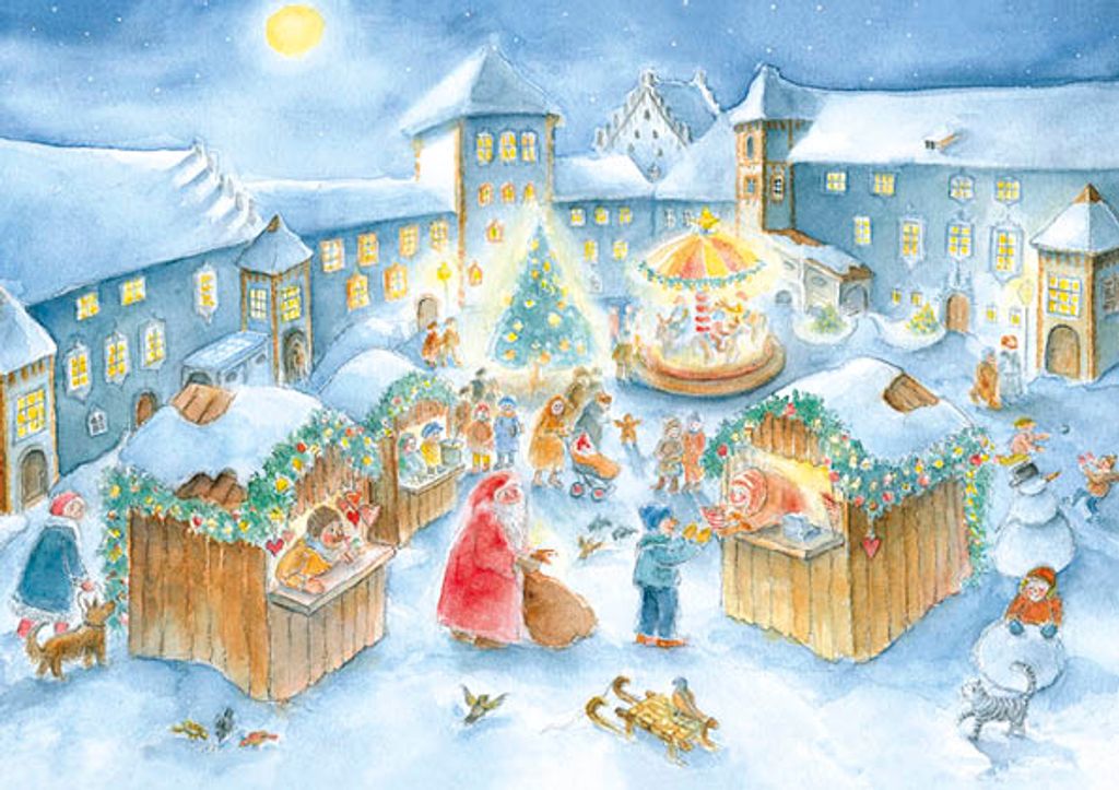 Upplev den glittrande stämningen på en klassisk julmarknad med denna vackra adventskalender illustrerad i varma akvarelltoner. Motivet visar ett charmigt vintertorg där människor samlas kring små marknadsbodar, julgranen lyser upp torget, och barnen åker karusell medan snön faller stilla. Tomten själv har kommit på besök med sin säck, och hela scenen andas gemenskap, glädje och julens förväntan. Bakom de 24 luckorna döljer sig små detaljer och överraskningar som gör väntan på julafton ännu mer magisk.