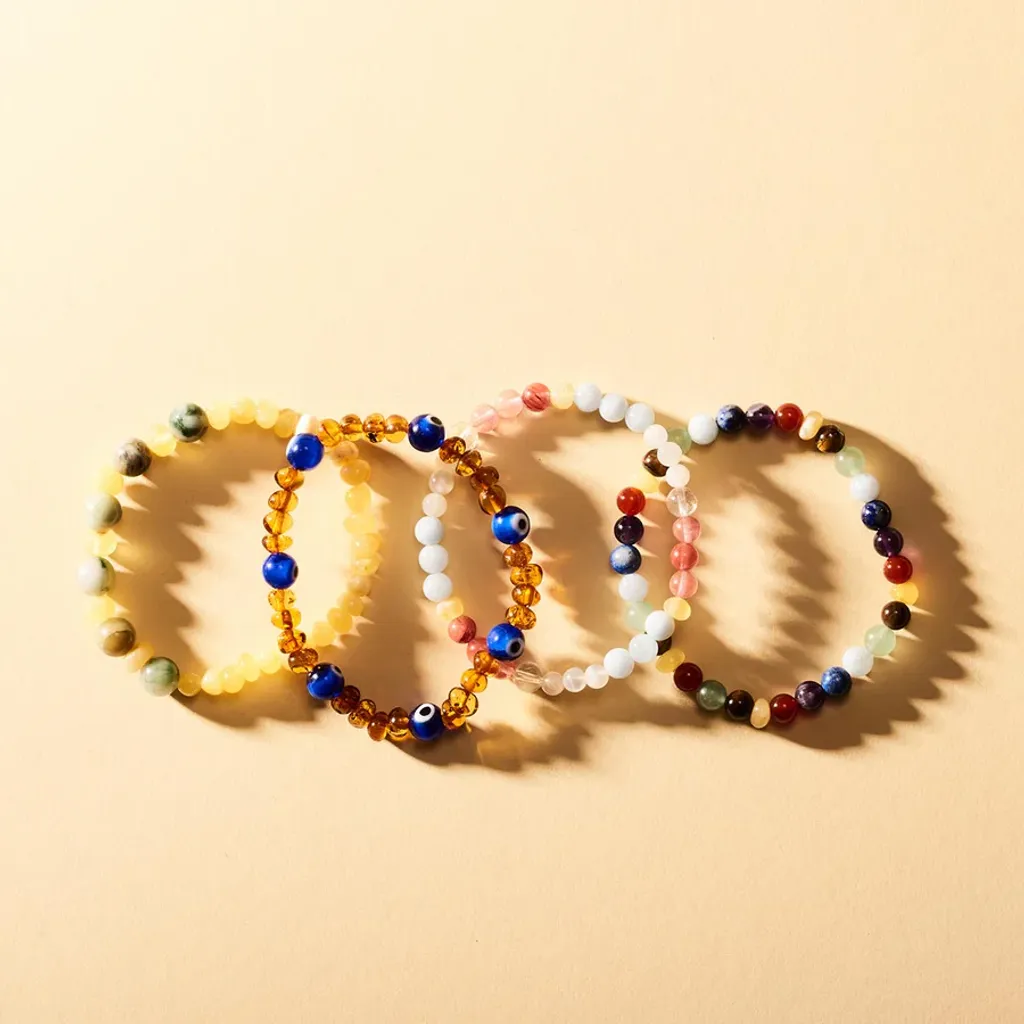 Material: Pärlor av mjölkig bärnsten, lapis lazuli, ametist, karneol, aventurin, akvamarin och tigeröga.