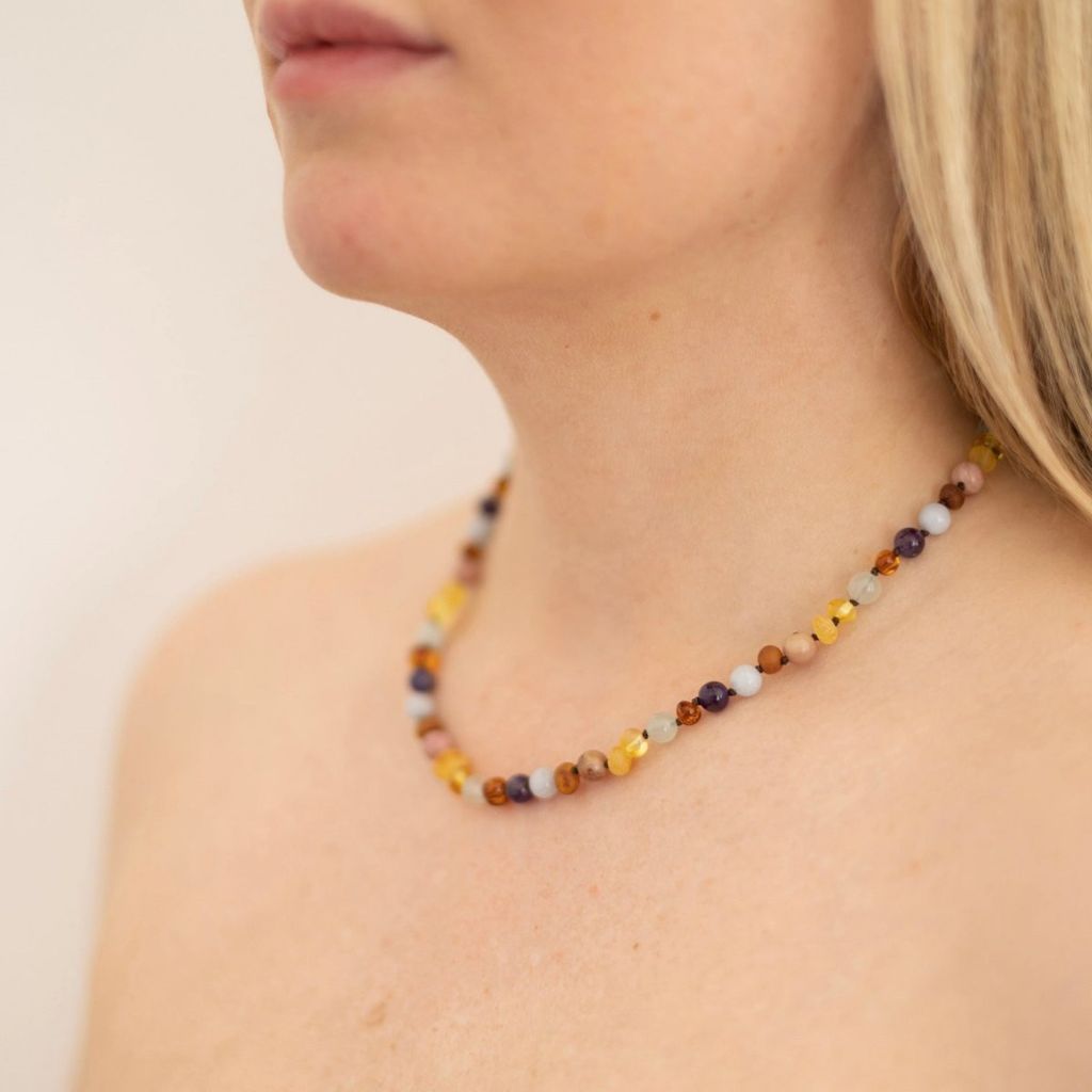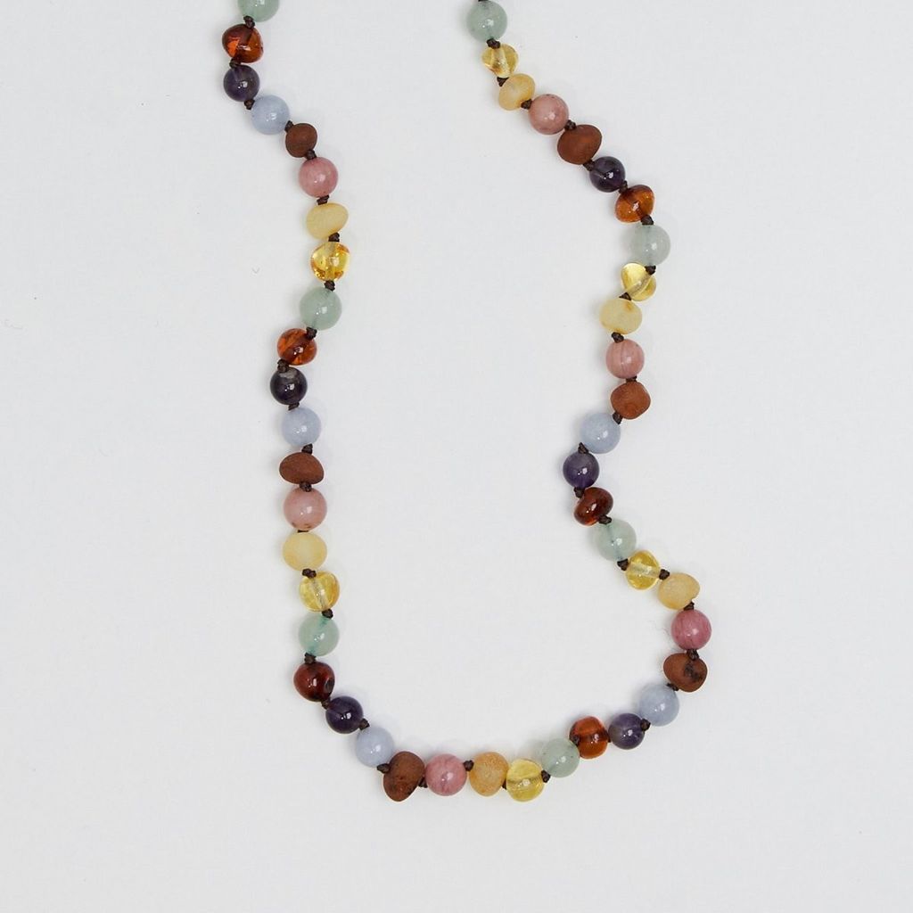 Material: Bärnsten, ametist, aventurin, rodokrosit och akvamarin, med silverlås.