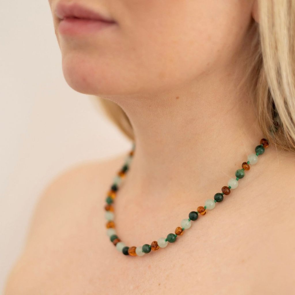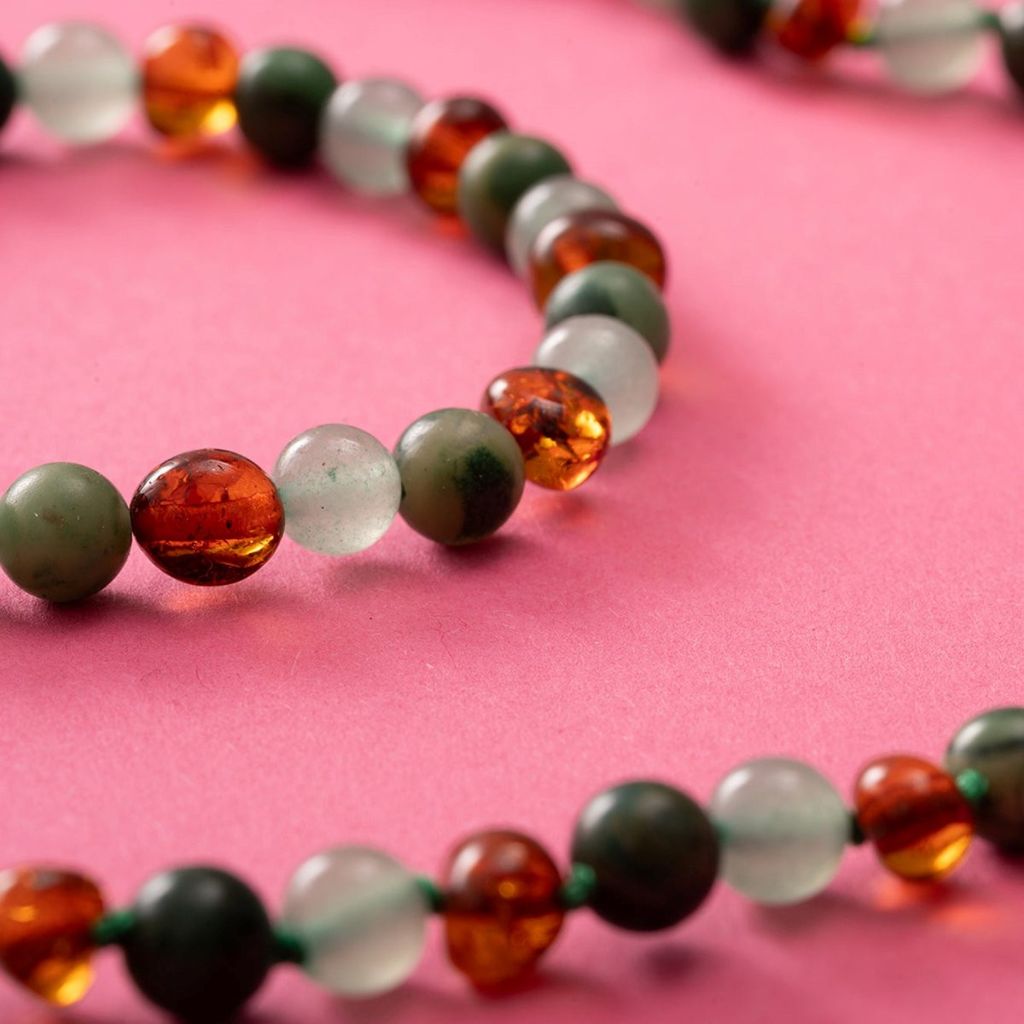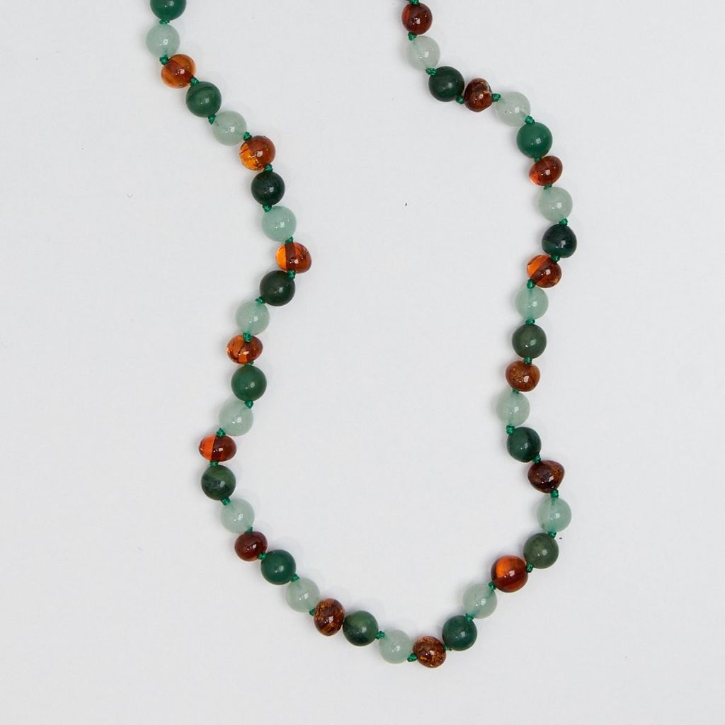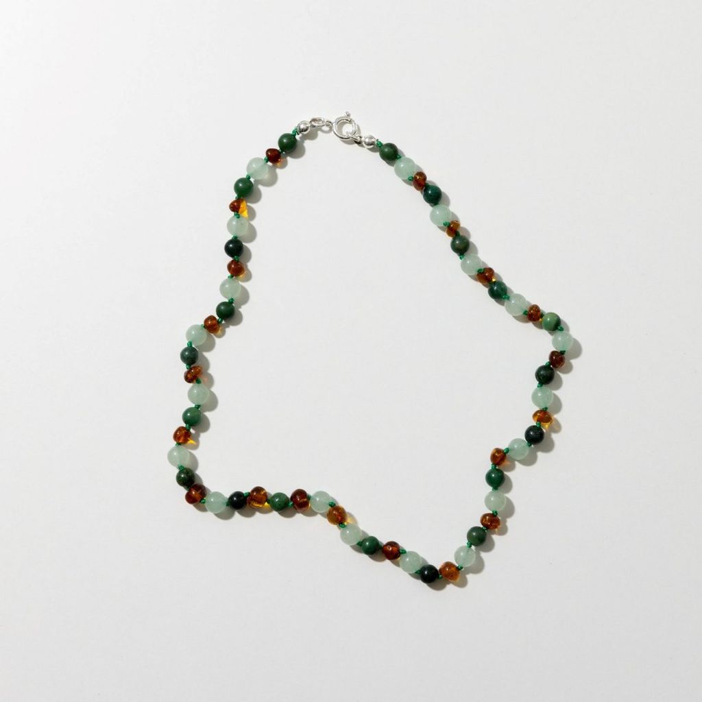 Material: Polerad bärnsten, aventurin och grön afrikansk jade, med silverlås.
