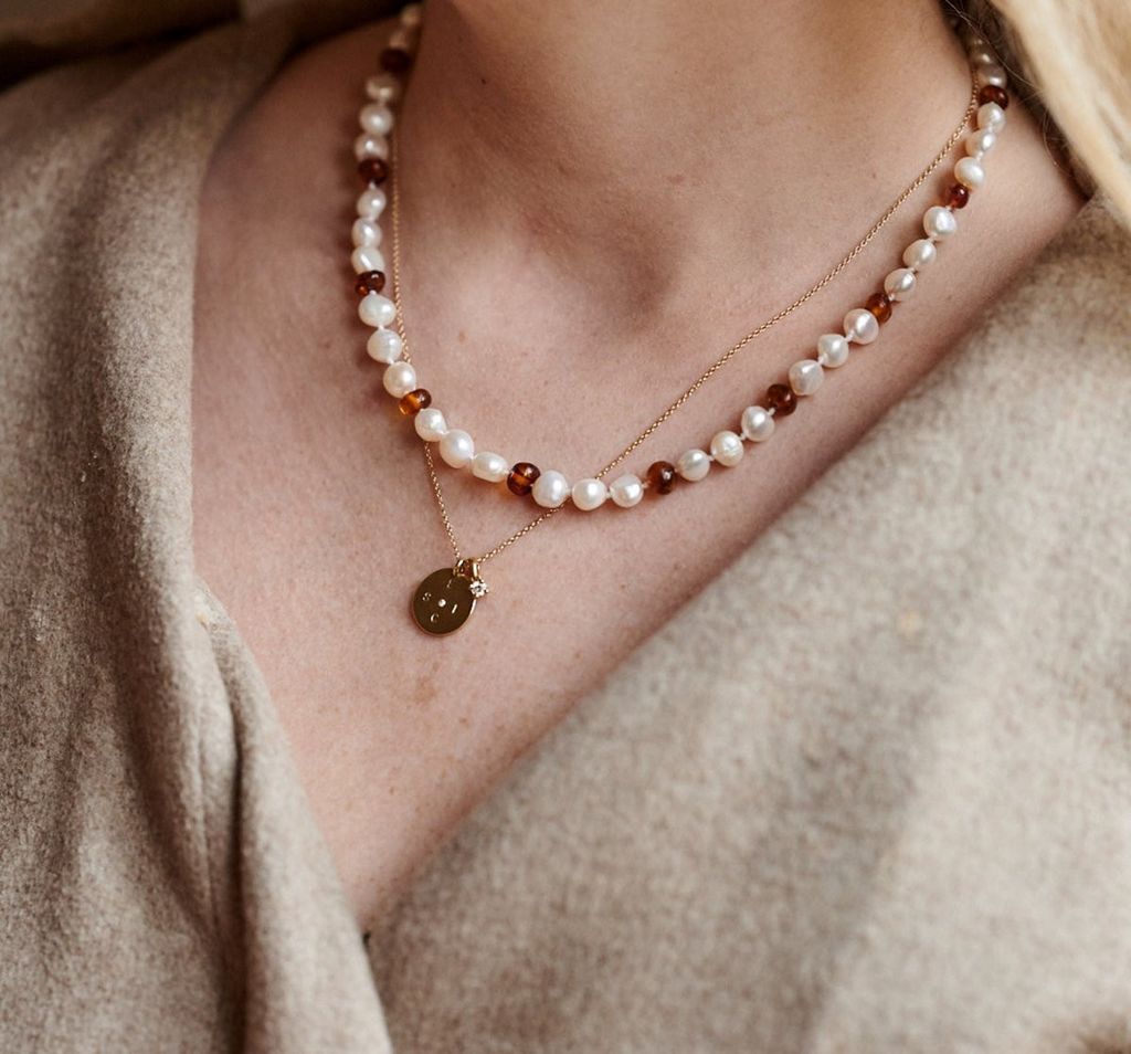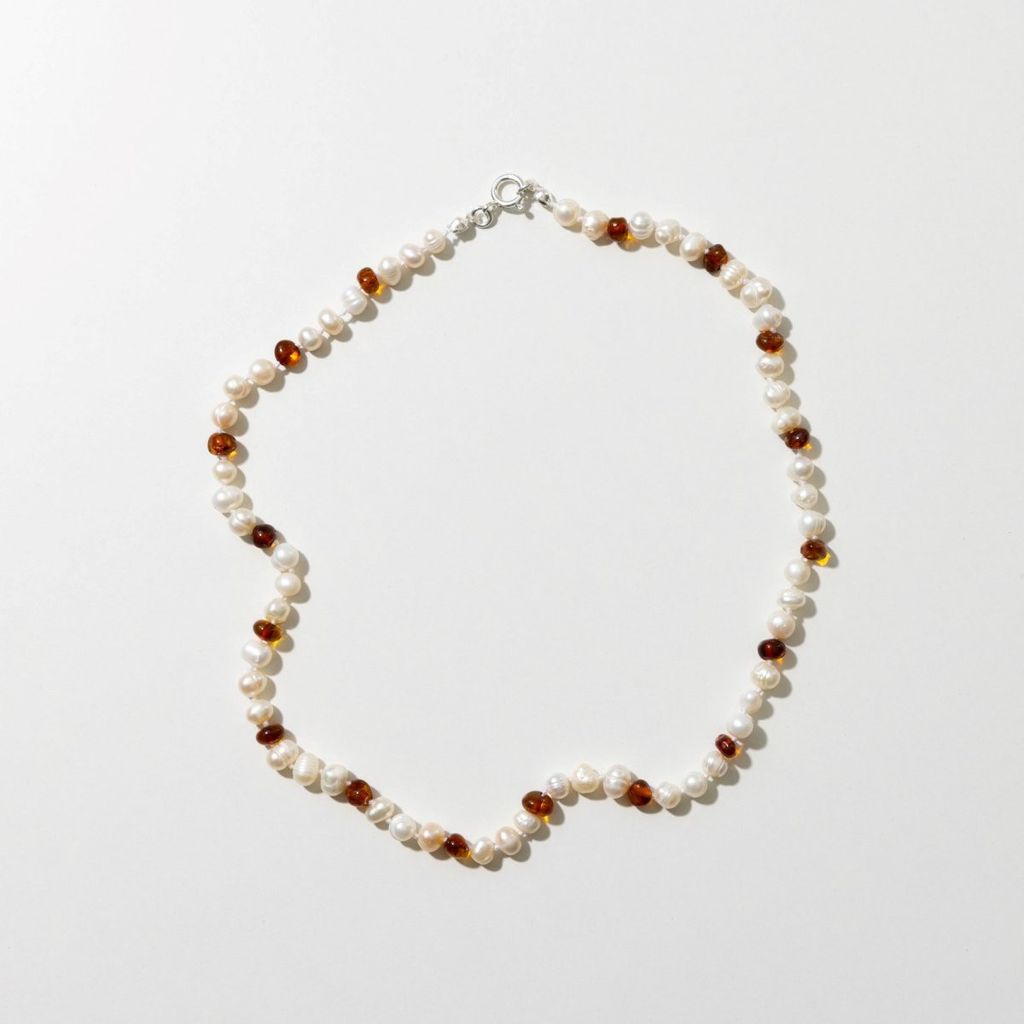 Material: Äkta sötvattenpärlor & bärnsten, med silverlås.