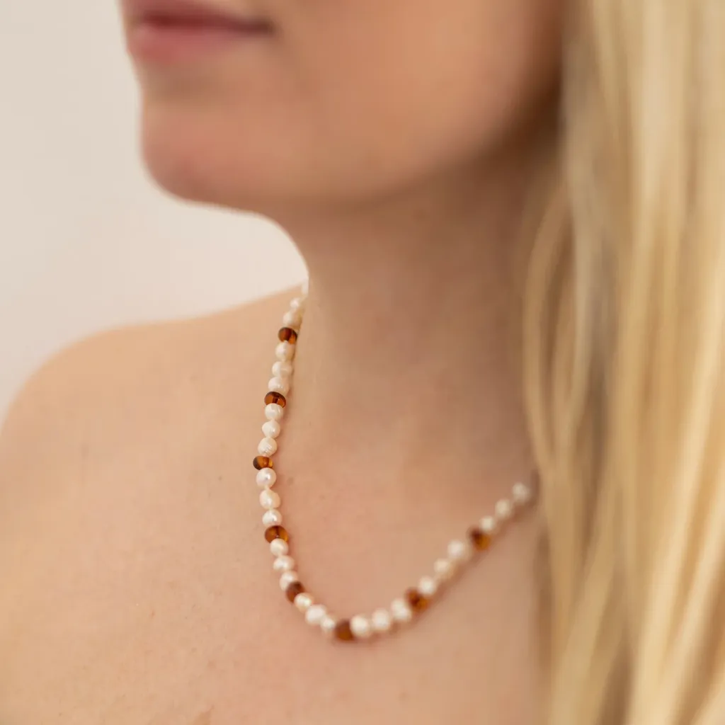 Vackert bärnstenshalsband med äkta sötvattenpärlor. Ett handgjort smycke med mycket kärlek från danska Nirrimis, levereras i vacker tygpåse. Finns i 2 storlekar.