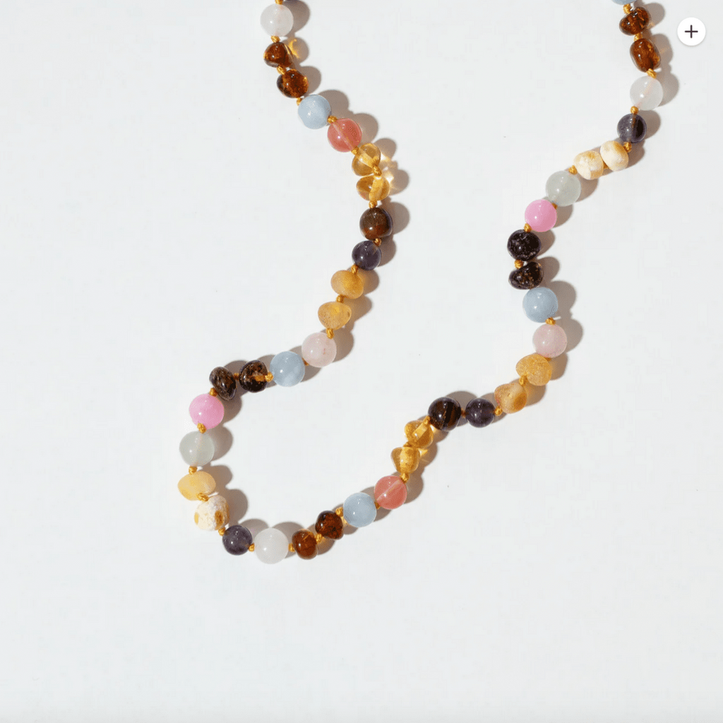 Notera att det här är ett smycke och inte en leksak, ska ej tuggas eller sugas på. Ta av smycket när barnet sover eller inte har tillsyn av en vuxen. Användning i vatten kan leda till att tråden i smycket försvagas över tid.