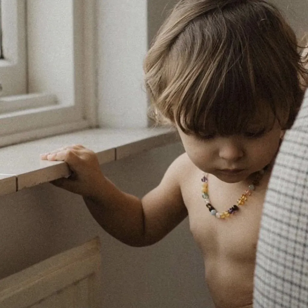 Vackert bärnstenshalsband för barn med äkta bärnsten från Östersjön. Ett handgjort smycke med mycket kärlek från danska Nirrimis, levereras i vacker tygpåse.