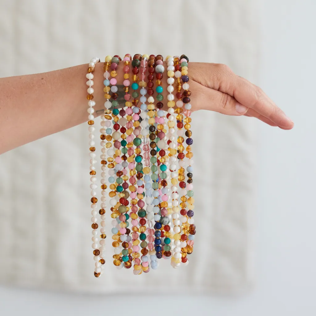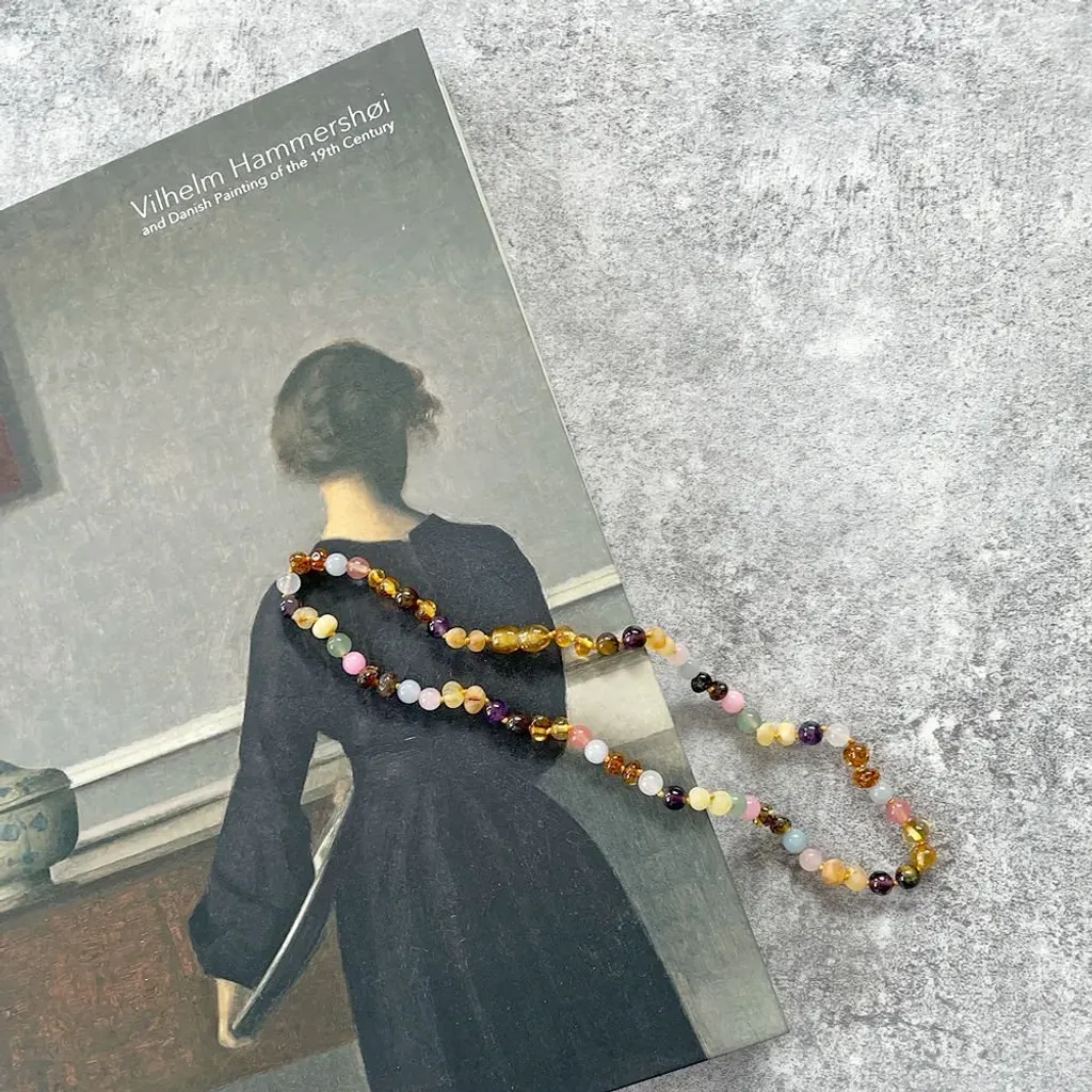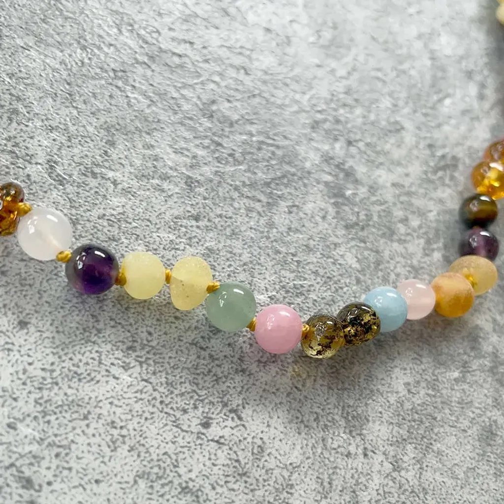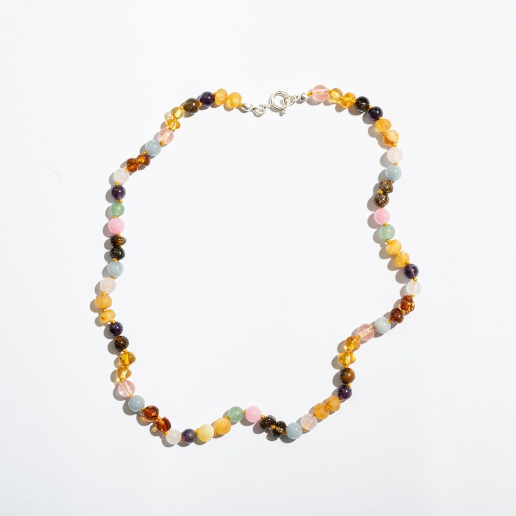 Material: Honungsbärnsten från Östersjön, Ametist, Aventurin, Jade, Körsbärskvarts, Labradorit, Månsten och Rosenkvarts. Med silverlås.