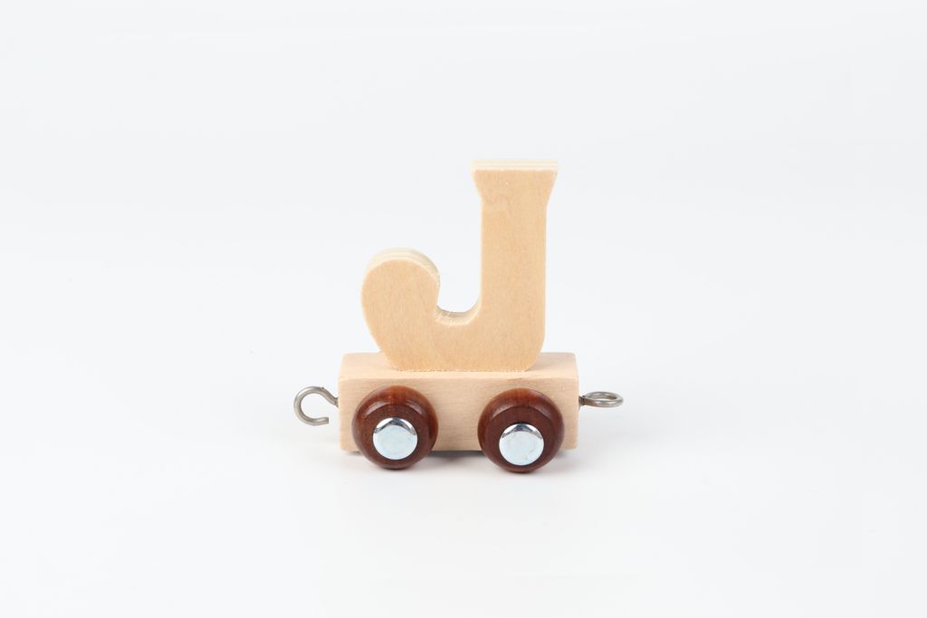 Fina Kinder and Kids namntåg och tågvagn med bokstaven J i naturligt trä är en del av det underbara namntåg, som kan sättas ihop genom att köpa flera delar till namnståget.