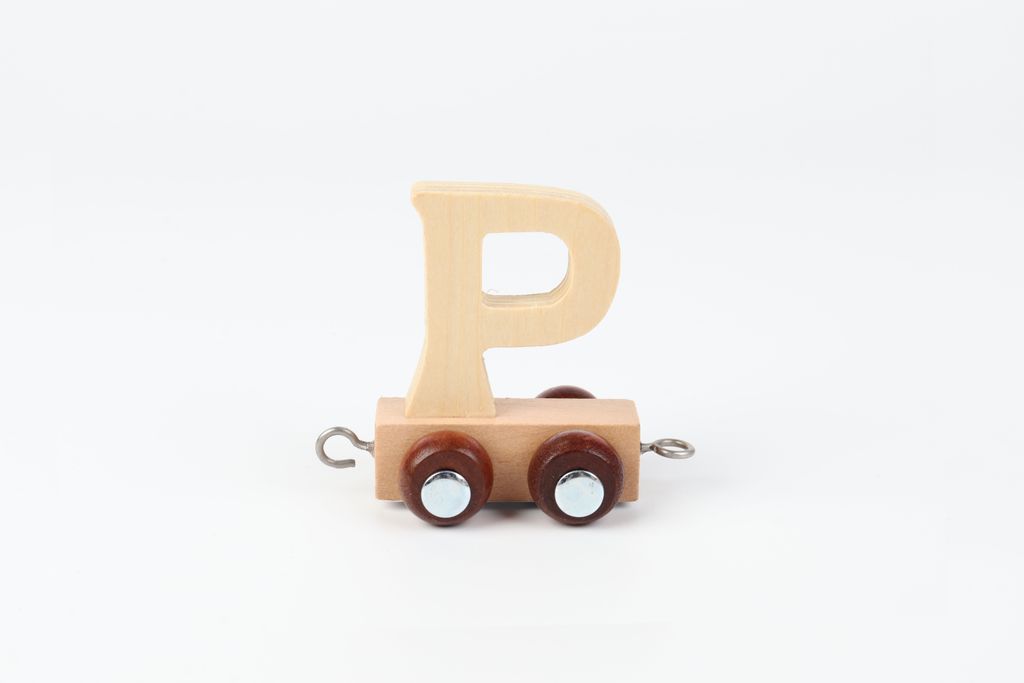 Fina Kinder and Kids namntåg och tågvagn med bokstaven P i naturligt trä är en del av det underbara namntåg, som kan sättas ihop genom att köpa flera delar till namnståget.