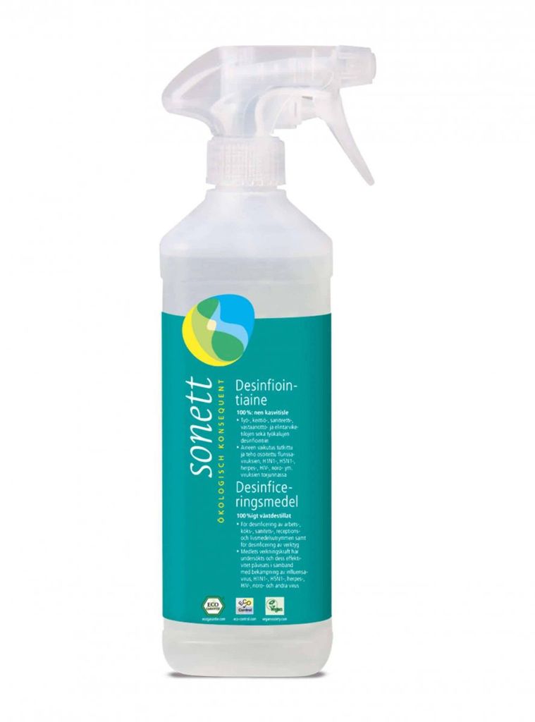 Rent vegetabiliskt desinficeringsmedel i bruksfärdig lösning. För desinficering av alla alkoholbeständiga ytor, arbetsytor och verktyg. Kombinationen av alkohol och eteriska oljor dödar effektivt svampar, jästbakterier, bakterier som salmonella eller kolibakterier och alla inkapslade virus så som HBV, HCV, HIV, herpes simplex, norovirus liksom alla mänskliga - och djurinfluensavirus inkl. H1N1, H5N. (Intyg på testresultat som bevisar effekten kan fås på begäran). Använd Sonett Desinficeringsmedel på ett säkert sätt. Läs alltid beskrivning och produktdata innan användning.