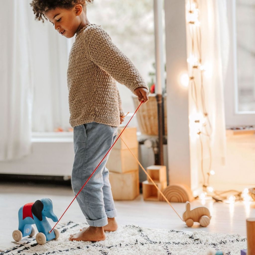 Otto är en blå träelefant med snöre.