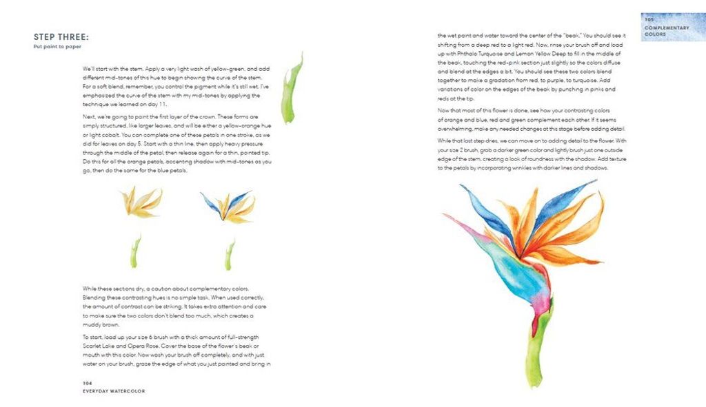 Everyday Watercolors är en samtida guide som uppmuntrar dig att måla akvarell varje dag. Boken börjar med grundläggande penseldrag och mönster och bygger sedan steg för steg vidare på dessa färdigheter under 30 dagar för att skapa färdiga konstverk.