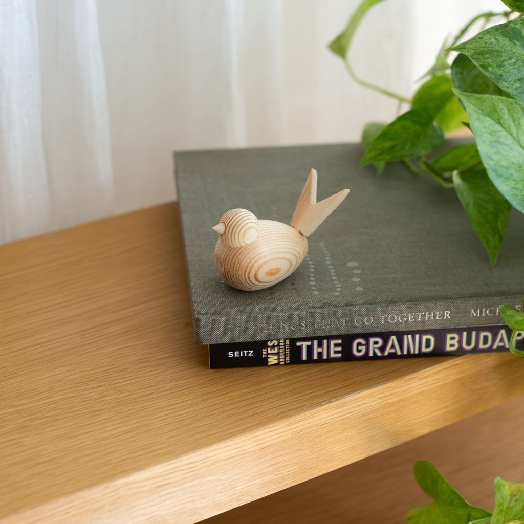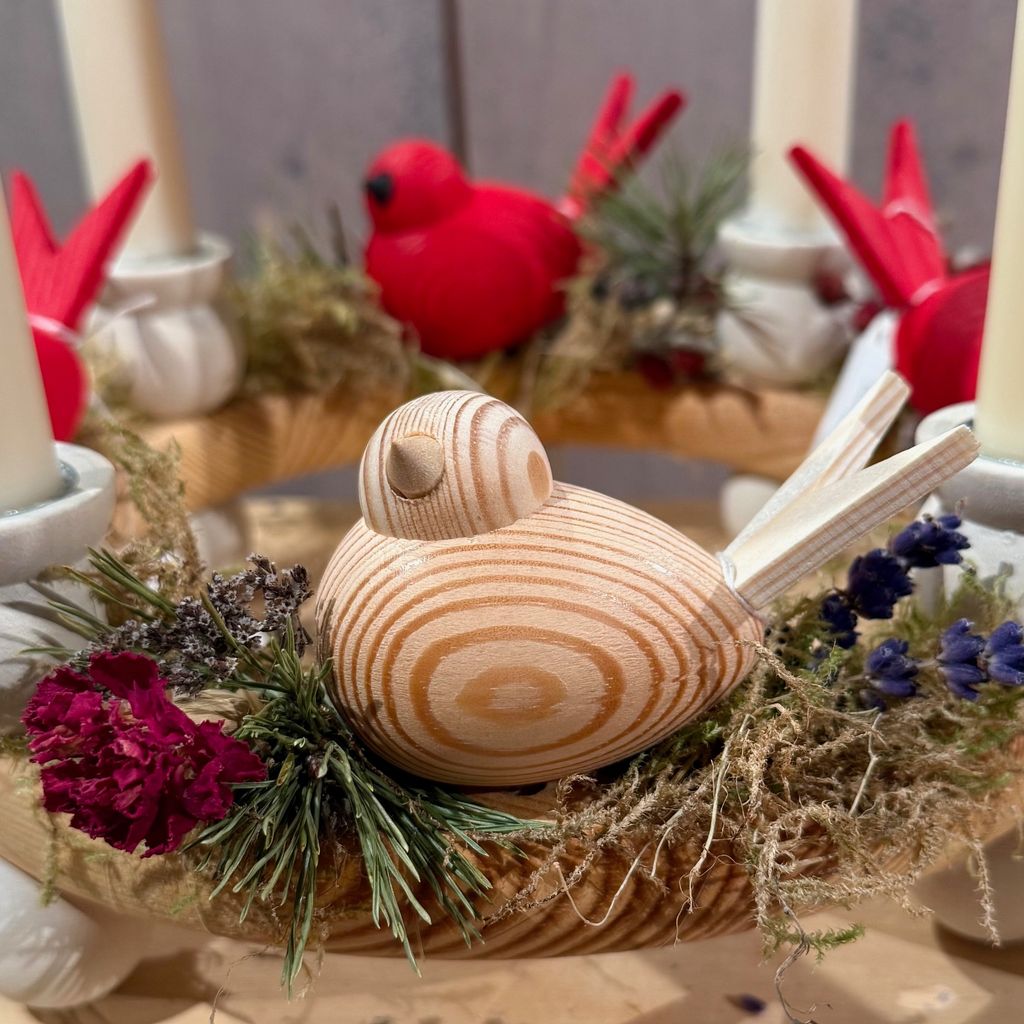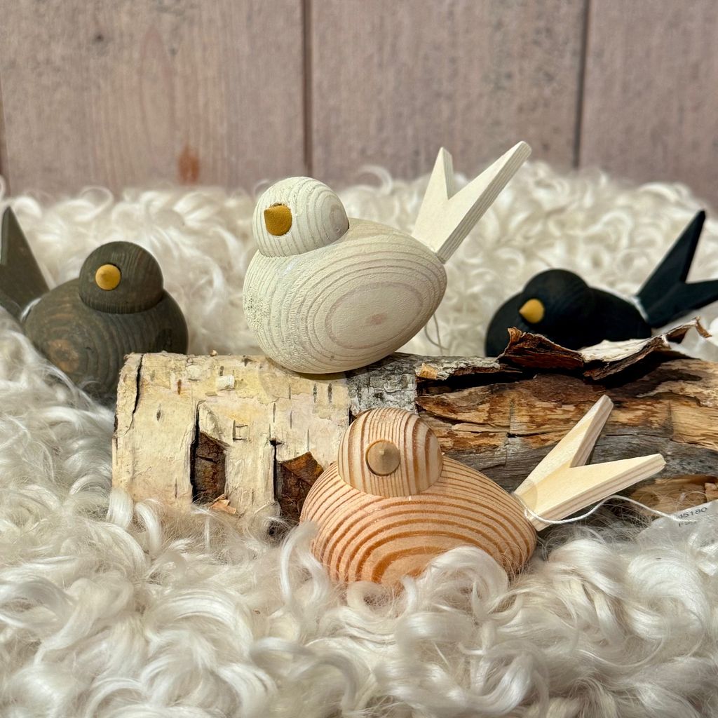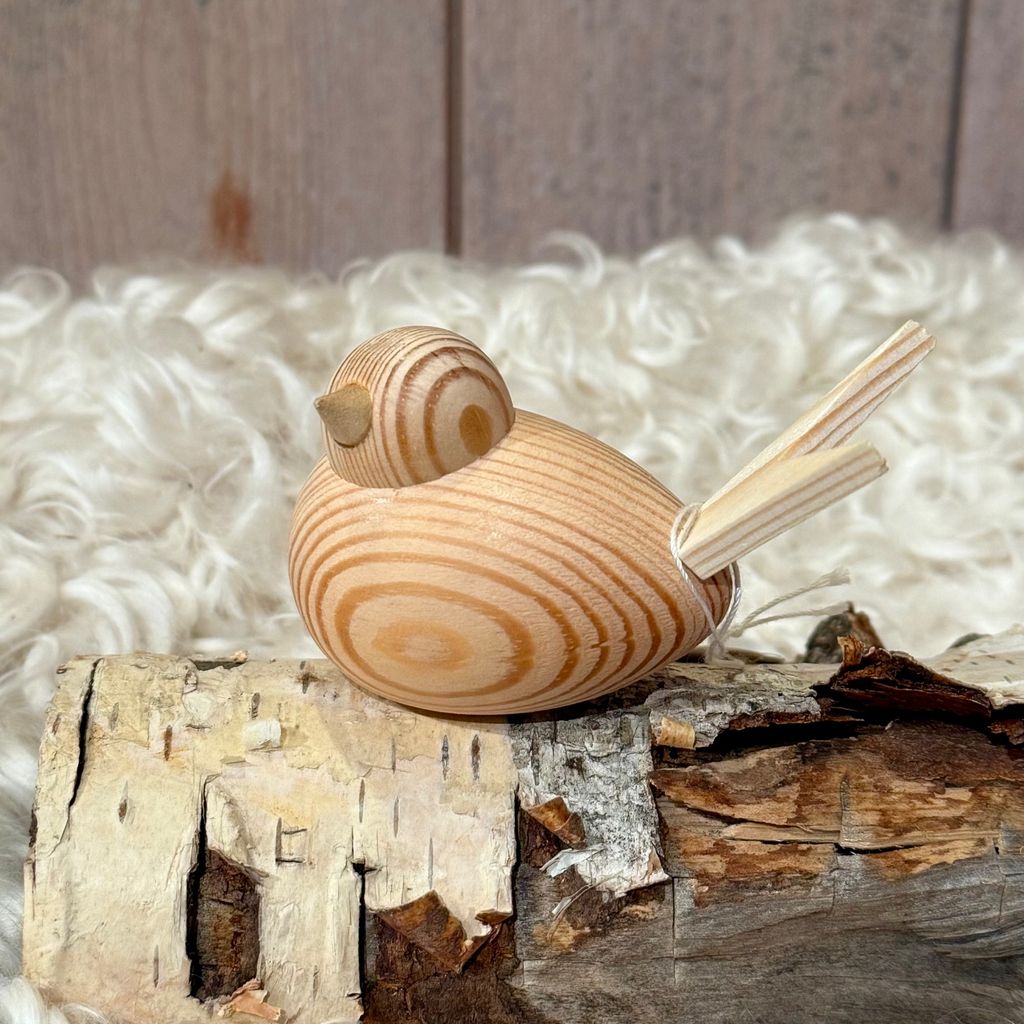 En fågel i trä, hantverksmässigt gjord med kärlek av Larssons trä i Tranemo, Sverige. En charmig liten sångfågel som kan liva upp fönsterbrädan, köksbordet eller kontorshörnan. Fågeln är sitter stabilt, men har även ett hål för en träplugg på undersidan dolt av ett litet klistermärke för att den ska kunna kombineras med fler produkter som ljusstakar och pappershållare.