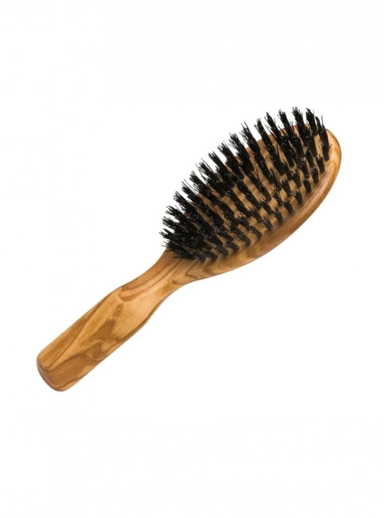 Avlång hårborste i vaxat olivträ. 7 rader med vildsvinsborst. 17,5cm lång.