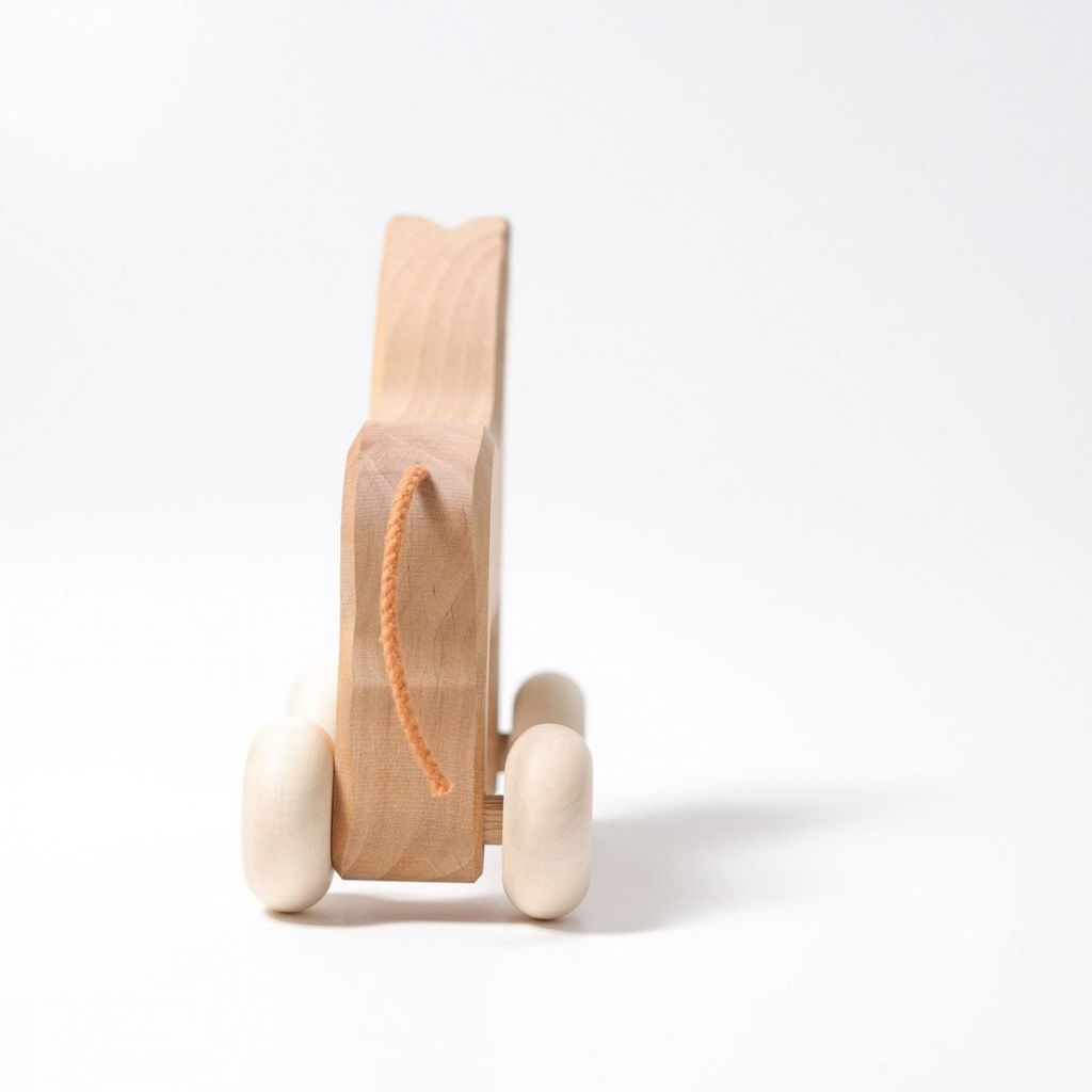 Hej Anna-Karin! Nej, det finns inget dragsnöre fastmonterad på hästen. Det gör den mer flexibel att leka med om man tex vill putta den framåt eller köra den med handen. Man kan enkelt göra en liten ögla runt halsen med ett eget dragsnöre när man vill dra den.