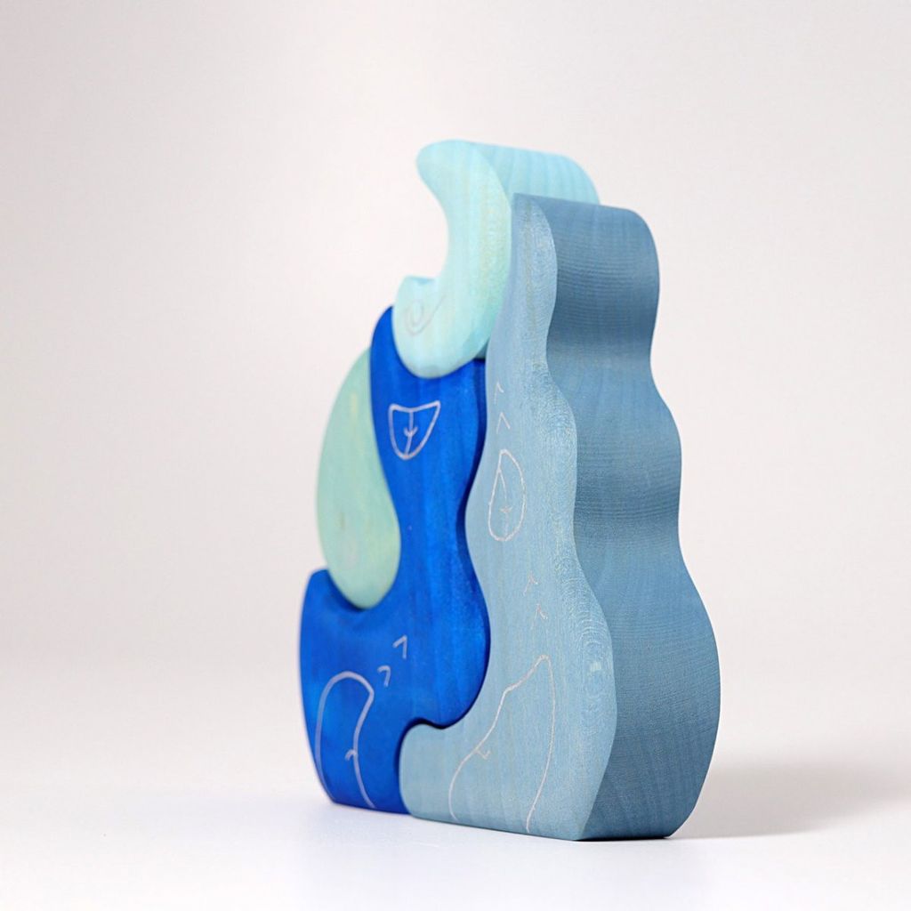 "Månhuset" består av 4 böljande träklossar. Klossarna är målade i skymningsblå färger beströdda med silverglans. De vackra klossarna blir lätt en spännande del av en fantasivärld!