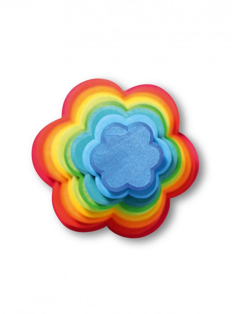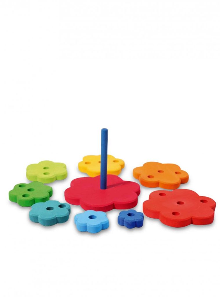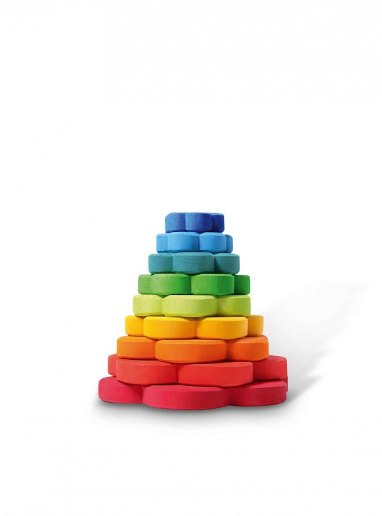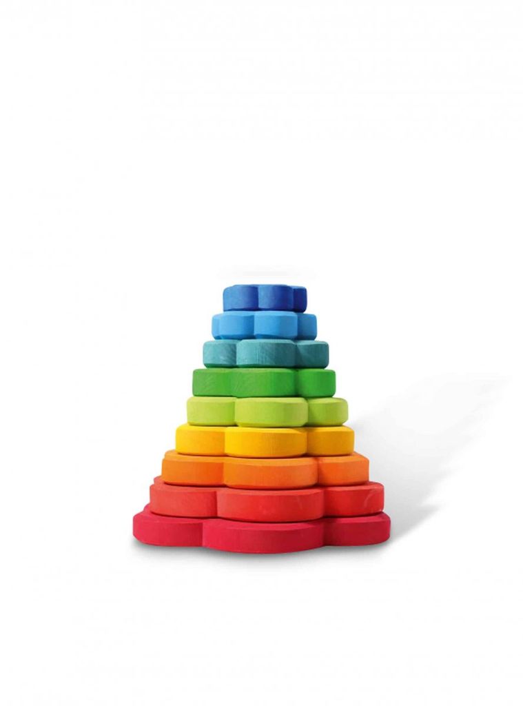Större klosstorn i blomdesign från Grimms, tillverkad i trä och behandlad med miljövänliga färger. 100% FSC märkt. Bredaste klossen är 20cm bred, minsta är 6cm bred. Tornet är ca. 20cm högt.