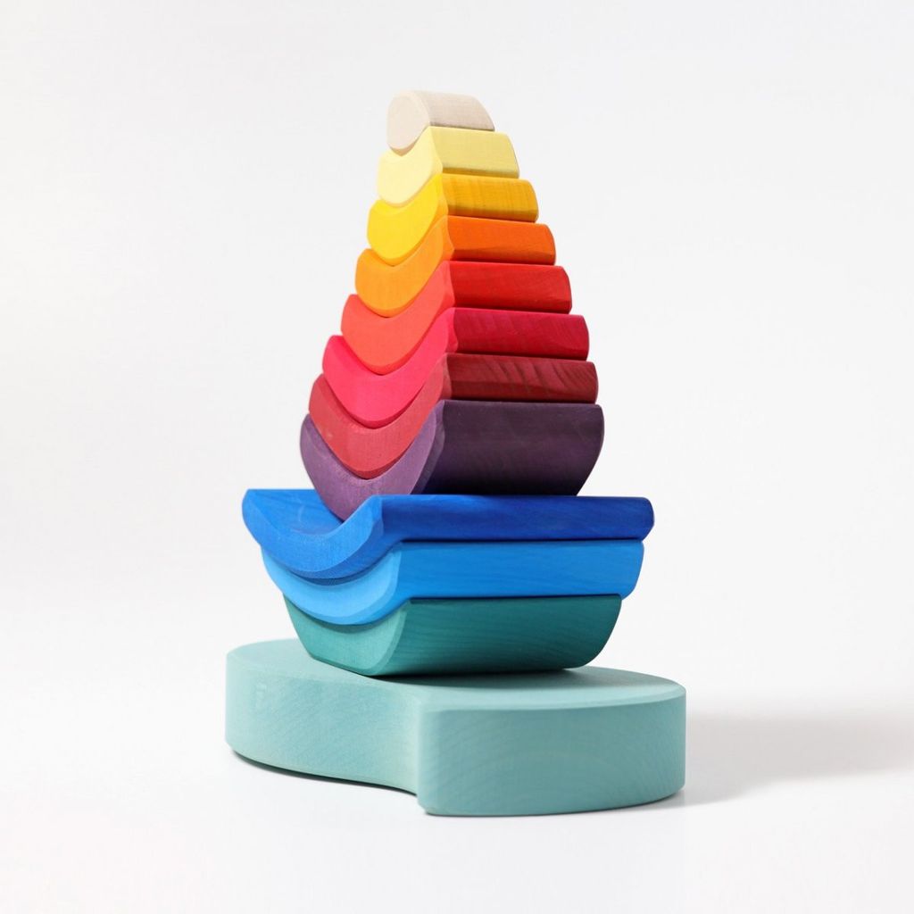 Klosstorn som ser ut som en segelbåt, tillverkad i trä från GRIMMS. Inbjudande till färgglad lek och att bygga med ro! Skapa en båt eller flera på det böjande havet eller använd klossarna till andra spännande byggen.