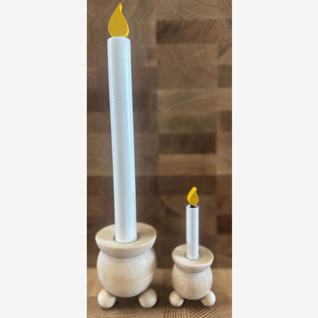 Rund ljusstake i trä som står på tre stycken kulfötter. Svensktillverkad ljusstake i trä med en metallinsats för ett stearinljus