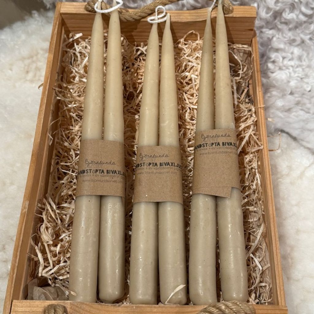 Handstöpta bivaxljus färgade med växtpigment - Ett äkta lokalt hantverk från Björnlunda arvet.