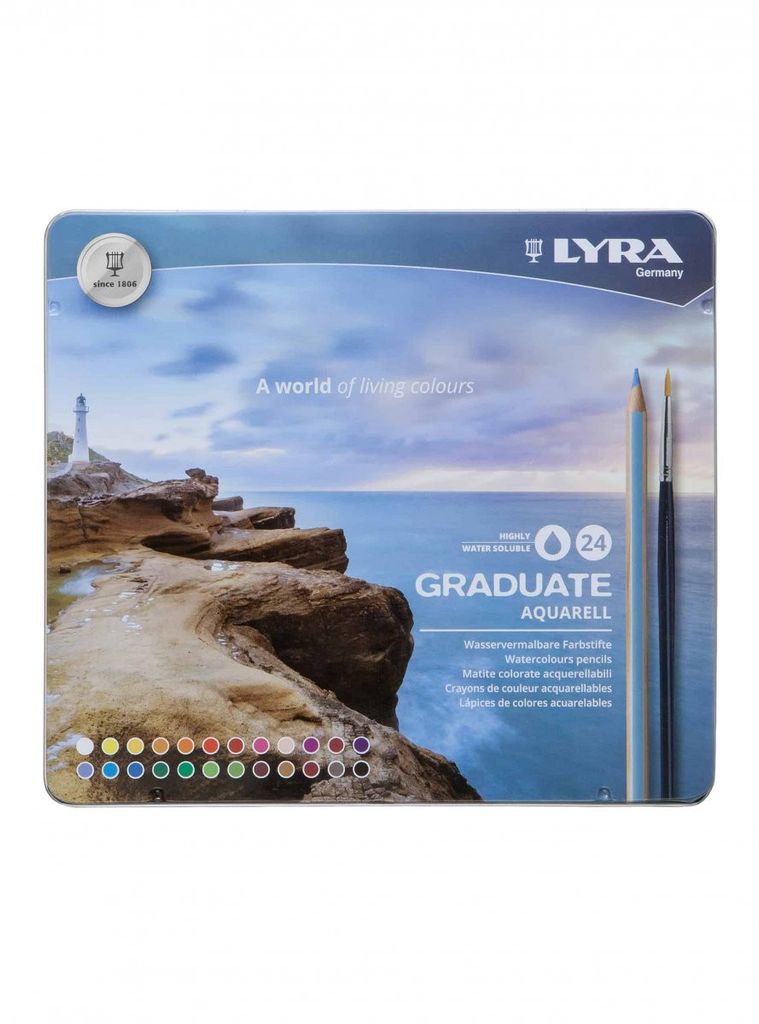 Metallask med 24st akvarellpennor från Lyra, samt 1st pensel med syntetisk borst. Gjorda av PEFC-certifierad cederträ. Med Lyra Graduate Aquarell kan du måla en värld av levande färger och skapa oändliga nyanser. 3.3mm spets som är extra hållbar.