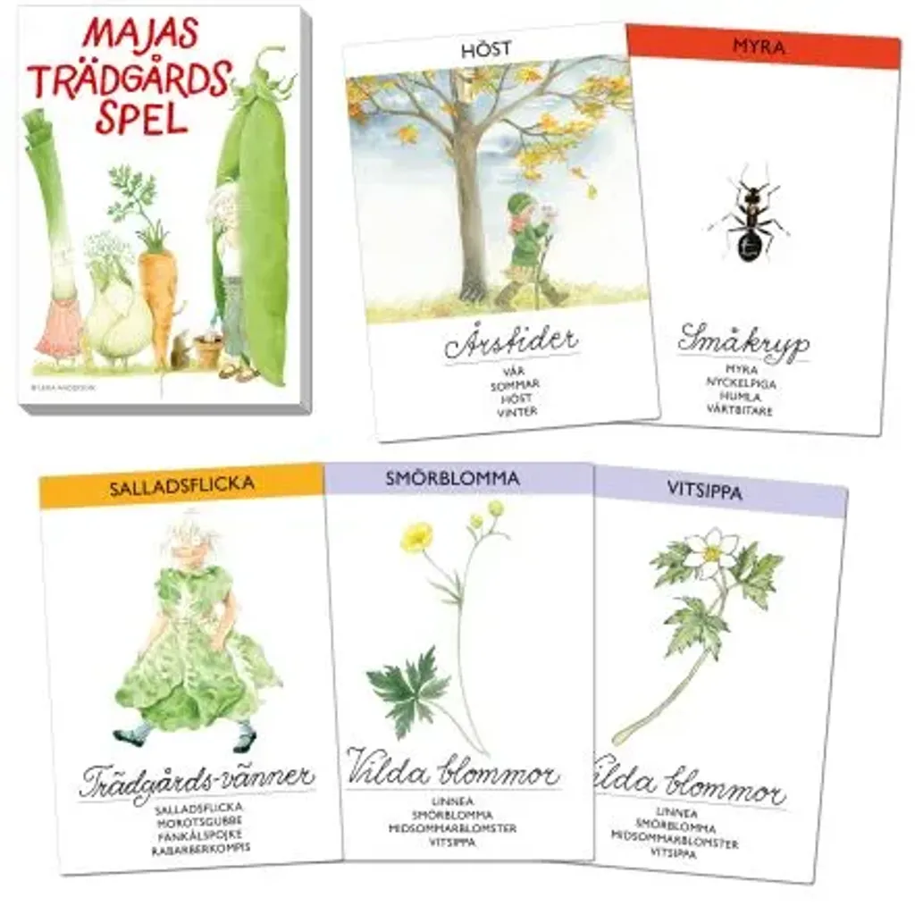 Majas trädgårsspel, är ett kvartettspel som går ut på att samla familjer. För 3-4 spelare. Majas trädgårdsspel är ett charmigt kvartettspel där spelarna samlar familjer av trädgårdens skatter, såsom grönsaker, blommor och bär. Illustrationerna är skapade av den älskade Lena Anderson, vilket ger spelet en visuell glädje för både barn och vuxna. Majas trädgårdsspel är ett underhållande och pedagogiskt spel som introducerar barn till trädgårdens mångfald på ett lekfullt sätt. Det är perfekt för familjekvällar och som en gåva till naturintresserade. Upplev glädjen i att samla trädgårdens skatter med Majas trädgårdsspel!