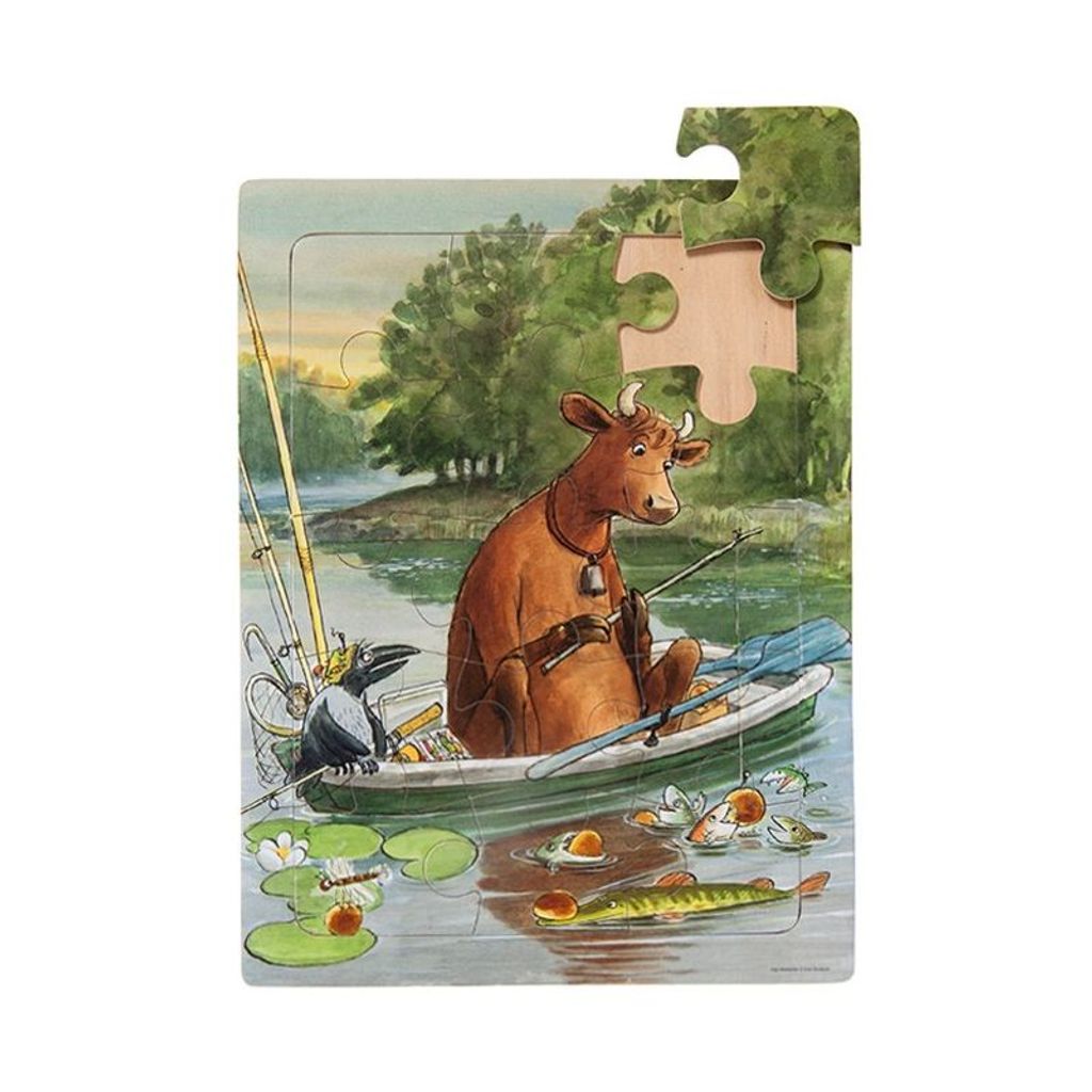 Ett charmigt rampussel i trä med 15 bitar, som avbildar Mamma Mu och Kråkan på fisketur, baserat på Jujja Wieslanders och Sven Nordqvists älskade karaktärer. Storlek 30 x 22 cm. Bilden visar ett färgglatt rampussel med 15 bitar, där motivet föreställer Mamma Mu och Kråkan sittande tillsammans i en båt på en lugn sjö, omgivna av näckrosor och grönska. Mamma Mu håller ett metspö, medan Kråkan sitter bredvid och ser nyfiket på. Illustrationen, skapad av Sven Nordqvist, är detaljrik och fångar den idylliska stämningen av deras gemensamma äventyr.