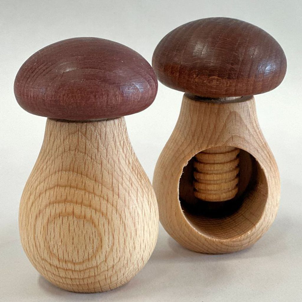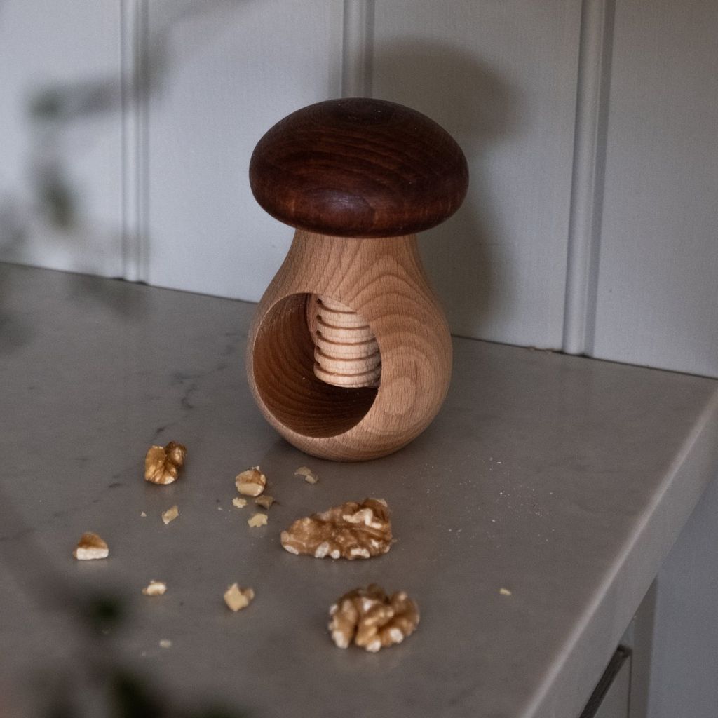 Charmig nötknäckare i oljad bok, i form av en präktig Karl-johan svamp. Rundade kanter för ett bekvämt och stadigt grepp. Kan krossa stora som små nötter med några enkla skruvtag. Inte bara praktisk, utan även en trevlig detalj på köksbänken.