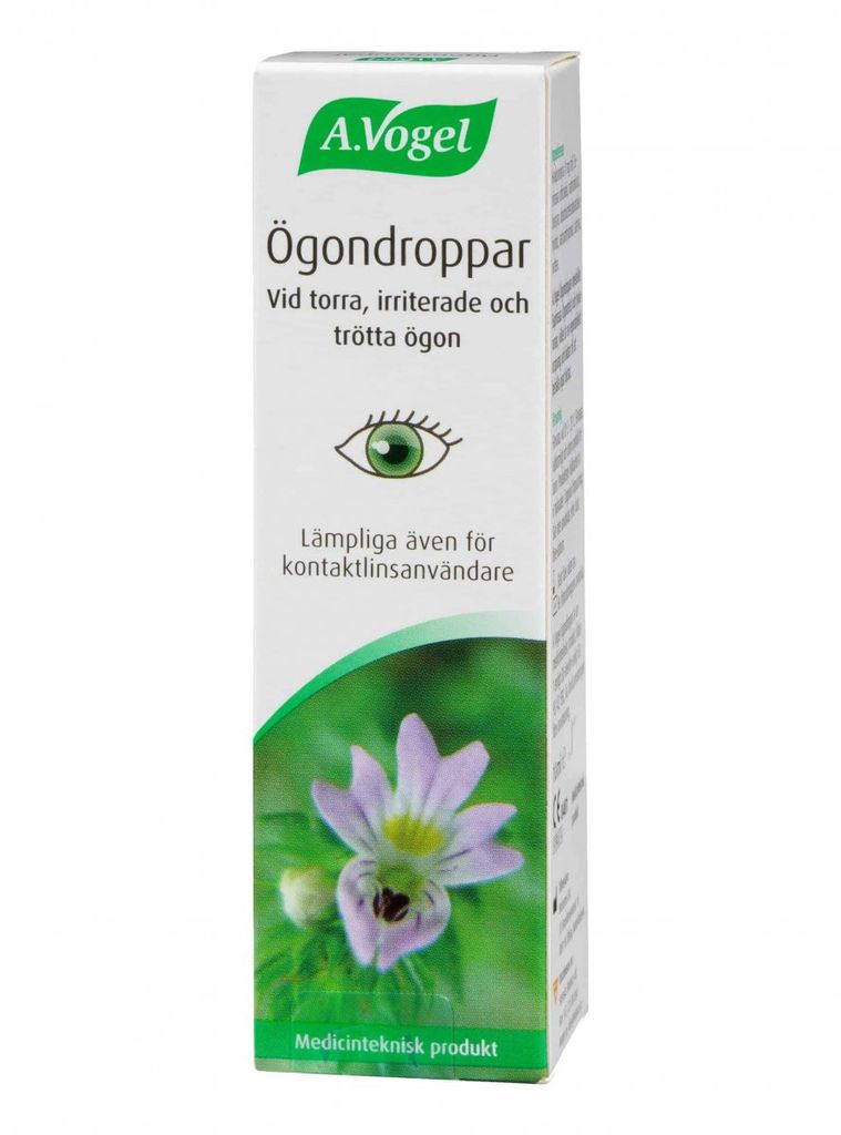 A.Vogel Ögondroppar innehåller Euphrasia (Ögontröst) och hyaluronan. Hyaluronanet i A. Vogel Ögondroppar är av vegetabiliskt ursprung och bidrar bland annat till att behålla ögat fuktigt.