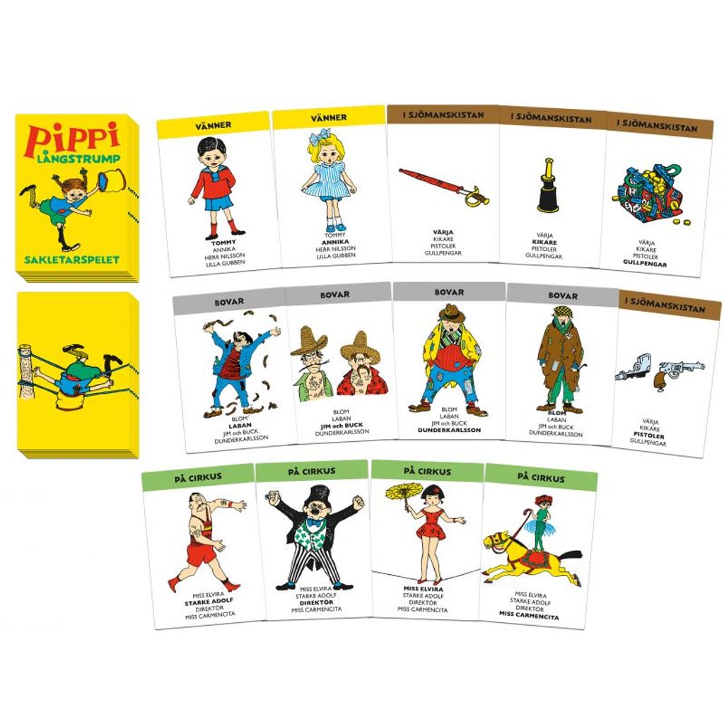 Pippi Sakletarspel är ett underhållande kortspel för hela familjen, där spelarna samlar olika familjer av karaktärer och föremål från Pippi Långstrumps värld. Spelet innehåller 48 kort, uppdelade i 12 familjer med fyra kort i varje, såsom vänner, vuxna, bovar och husdjur. Målet är att samla flest kompletta familjer genom att be andra spelare om specifika kort eller dra från högen. Spelet främjar social interaktion och strategiskt tänkande, och är lämpligt för 3–4 spelare från 5 år och uppåt.