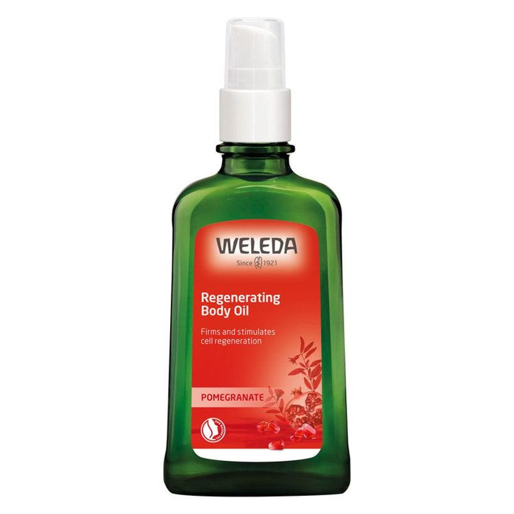 Weleda Pomegranate Regenerating Body Oil är en näringsrik och silkeslen kroppsolja som stödjer hudens naturliga förnyelse och hjälper till att bevara dess fasthet och elasticitet. Den exklusiva blandningen av ekologisk granatäpplefröolja, aprikoskärnolja och jojobaolja tillför intensiv återfuktning och ger huden en mjuk, strålande känsla. Granatäpplefröoljan är rik på antioxidanter och skyddar huden mot fria radikaler, vilket bidrar till att förebygga tidiga ålderstecken. Oljan absorberas snabbt, utan att kännas kladdig, och lämnar huden sammetslen och återfuktad med en naturlig lyster. Doften är sensuell och varm, med fruktiga och kryddiga toner som gör hudvården till en lyxig stund av välbefinnande.
