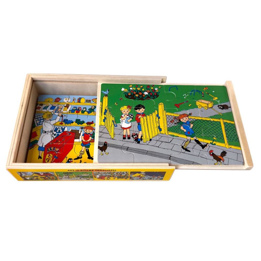 Denna trälåda innehåller av fyra träpussel, vart och ett med 12 bitar, föreställande scener ur Astrid Lindgrens älskade berättelser om Pippi Långstrump. Varje pussel mäter 12 x 17 cm.