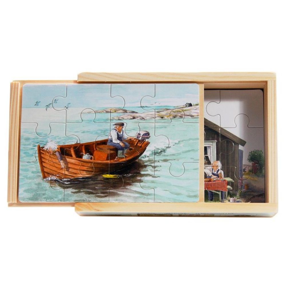 Upptäck "Stormstina 4 x Träpussel" – en trälåda som innehåller fyra 12-bitars pussel med motiv från Lena Andersons älskade berättelse om Storm-Stina.