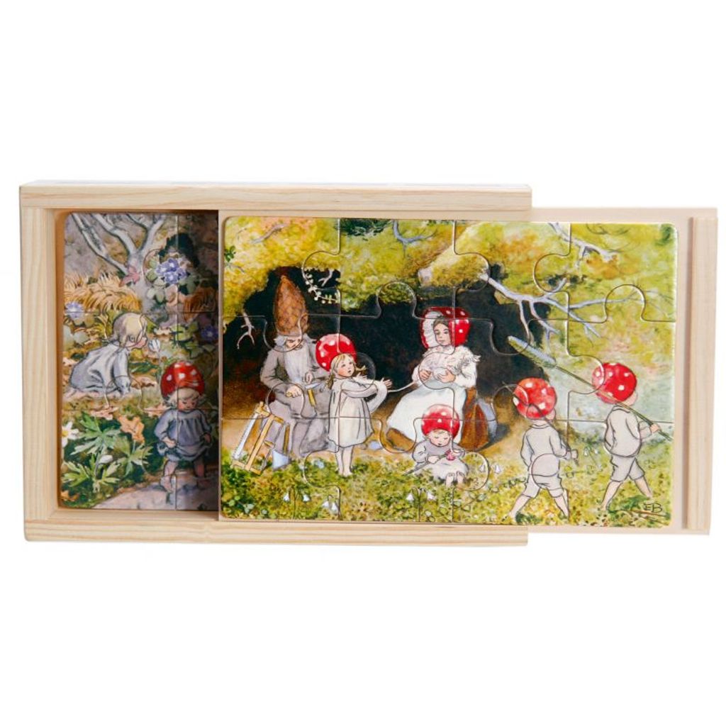 Följ med Tomtebobarnen genom årstiderna i detta söta pussel som väcker minnen hos alla vuxna och känsla för naturens magi hos barnen. Den här lådan innehåller fyra 12-bitarspussel i trä med motiv ur Elsa Beskows Tomtebobarnen. Pusslen levereras i en trälåda med skjutlock, vilket gör det enkelt att förvara och hålla ordning på dem. Varje pussel mäter cirka 12 x 17,5 cm. Varje pussel består av 12 bitar som tillsammans skapar detaljrika och fantasifulla scener från den älskade berättelsen om tomtefamiljen som bor djupt inne i skogen. Illustrationerna fångar barnens nyfikenhet och inbjuder till lekfullt lärande.