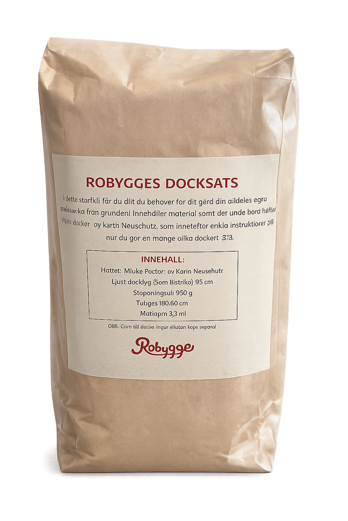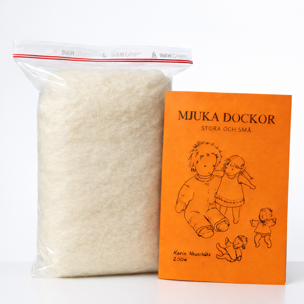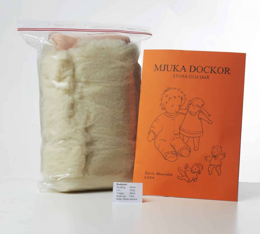 I docksatsen ingår: Docktyg (bomullstrikå) 65cm - Stoppningsull 350g - Tubgas 10x60 cm - Mattvarp 3,5m - Häftet "Mjuka dockor" av Karin Neuschütz