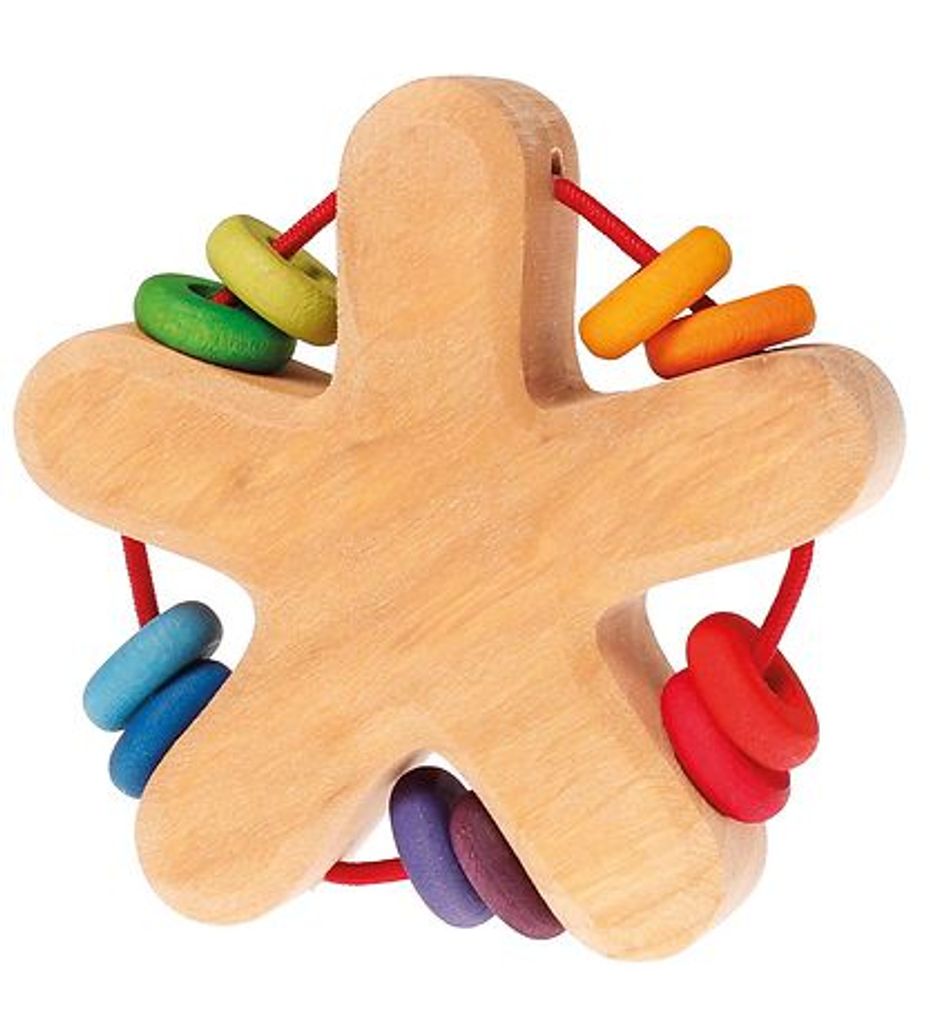 Skallra i form av en stjärna från Grimms. Skallran är gjord i trä och är perfekt för småttingar som fortfarande utvecklar sina motoriska färdigheter och sinnen. Skallran har en bra form, så den är lätt även för de små att hålla i, och när man skakar den ger ringarna på sidorna ifrån sig lugnande ljud.