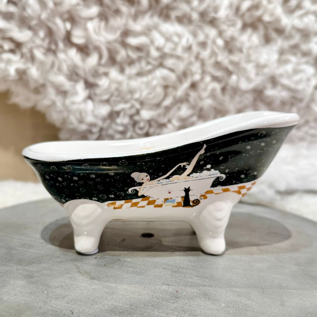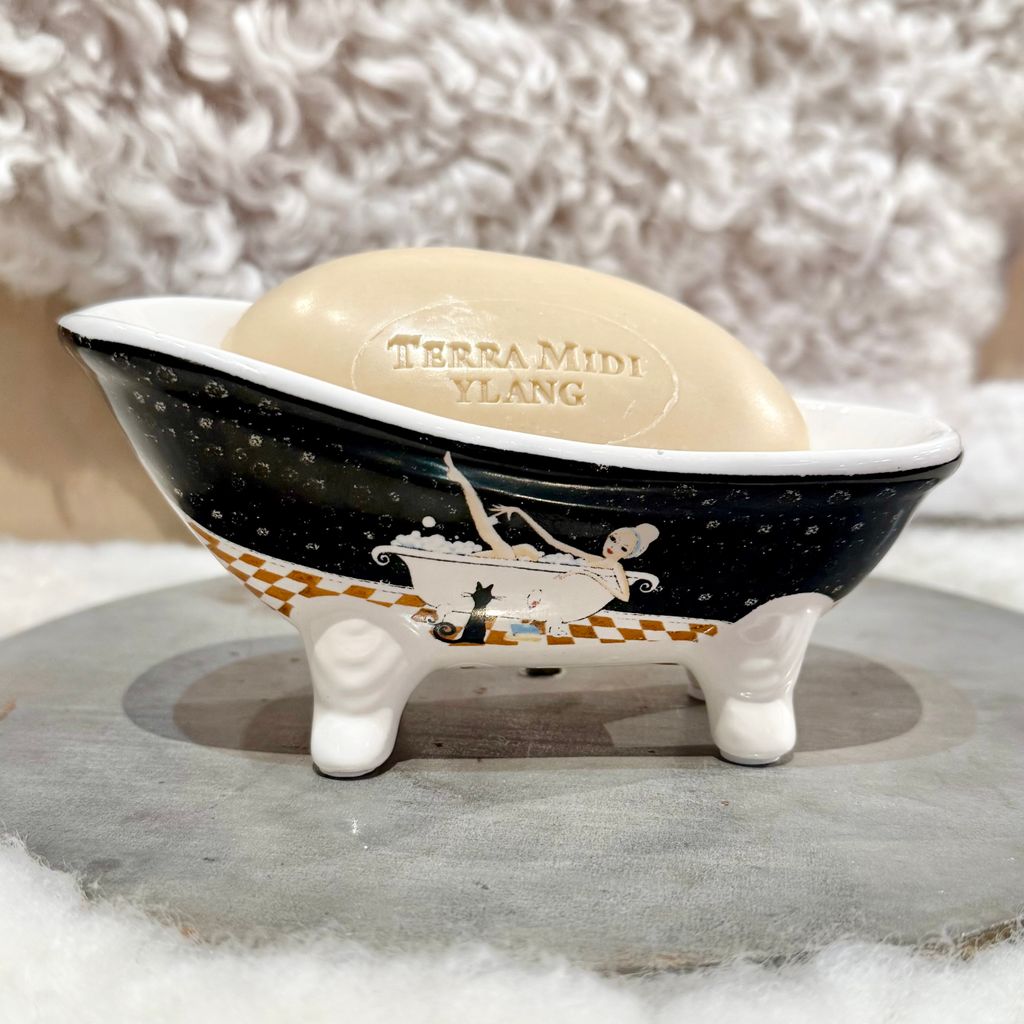 Tvålfat i form av ett badkar med Cleopatra-motiv. Håller tvålen torr och är en fin detalj i badrummet.