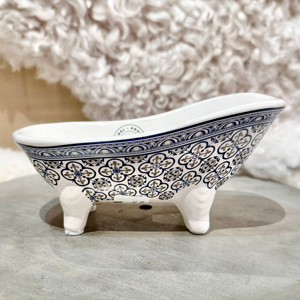 Vitt tvålfat i form av ett badkar med mosaik-motiv i blått. Håller tvålen torr och är en fin detalj i badrummet.
