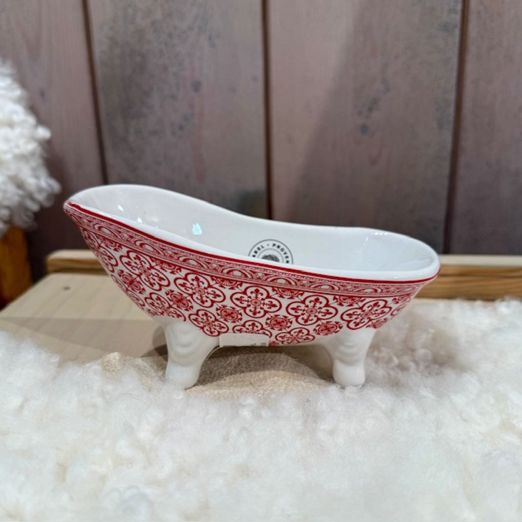 Vitt tvålfat i form av ett badkar med mosaik-motiv i rött. Håller tvålen torr och är en fin detalj i badrummet.