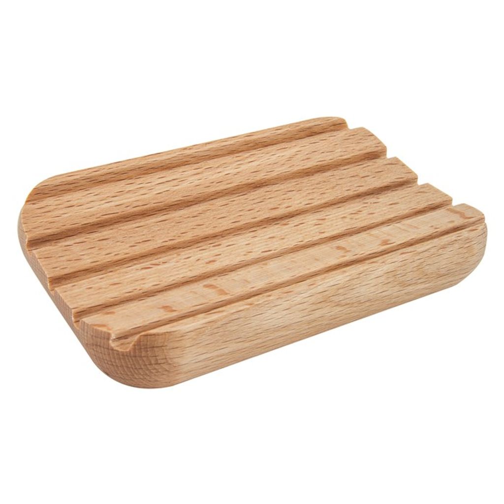 Tvålhållare av oljat bokträ med skåror som hjälper vattnet att rinna bort så att tvålen hinner torka mellan tvättarna. Redeckers tvålhållare har rundade hörn och gummifötter på undersidan. Mått: 11,5 x 7 cm