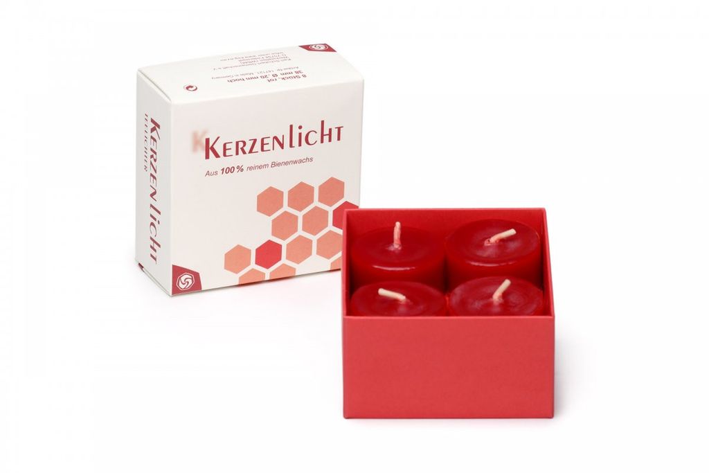 8st värmeljus av 100% bivax, färg: röd. Storlek 20x38 mm, brinntid ca 4,5 timmar.