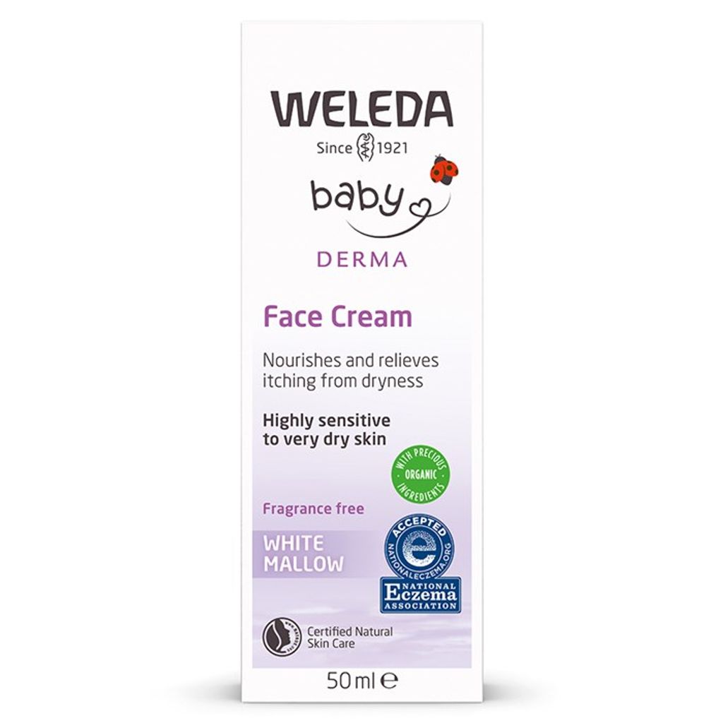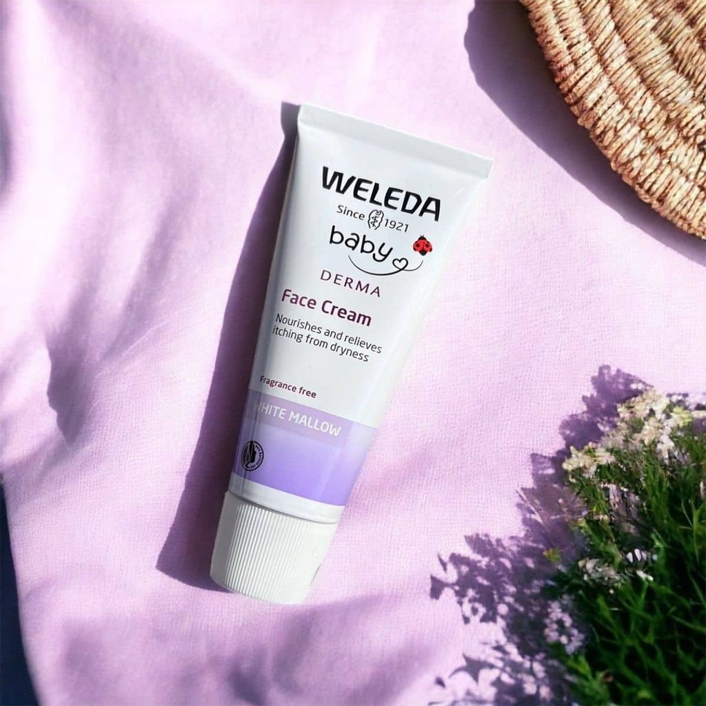 Weleda White Mallow Face Cream tar hand om ditt barns särskilt känsliga hud från första dagen – med helt naturliga ingredienser. Vit malva verkar som ett lugnande och skyddande lager på huden och bevarar hudens fuktighetsgrad och stillar klåda. Ekologisk kokos- och sesamolja ger huden intensiv vård. Mild, parfymfri ansiktskräm.Extra snäll mot en överkänslig och torr babyhud.Lugnande och näringsgivande.Dermatologiskt testad.Användning: Applicera på huden dagligen eller vid behov.